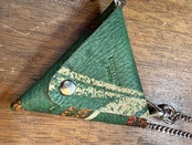 三角形の小物入れ。表には手書きのイラスト入りです。開け閉めする部分にはバネホックを採用。表と裏のどちらからでも開閉できます。