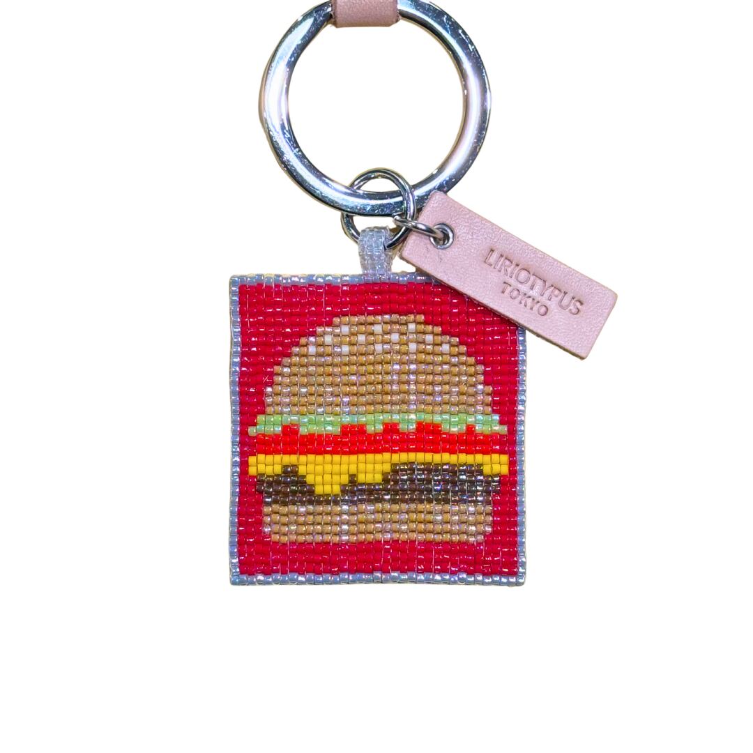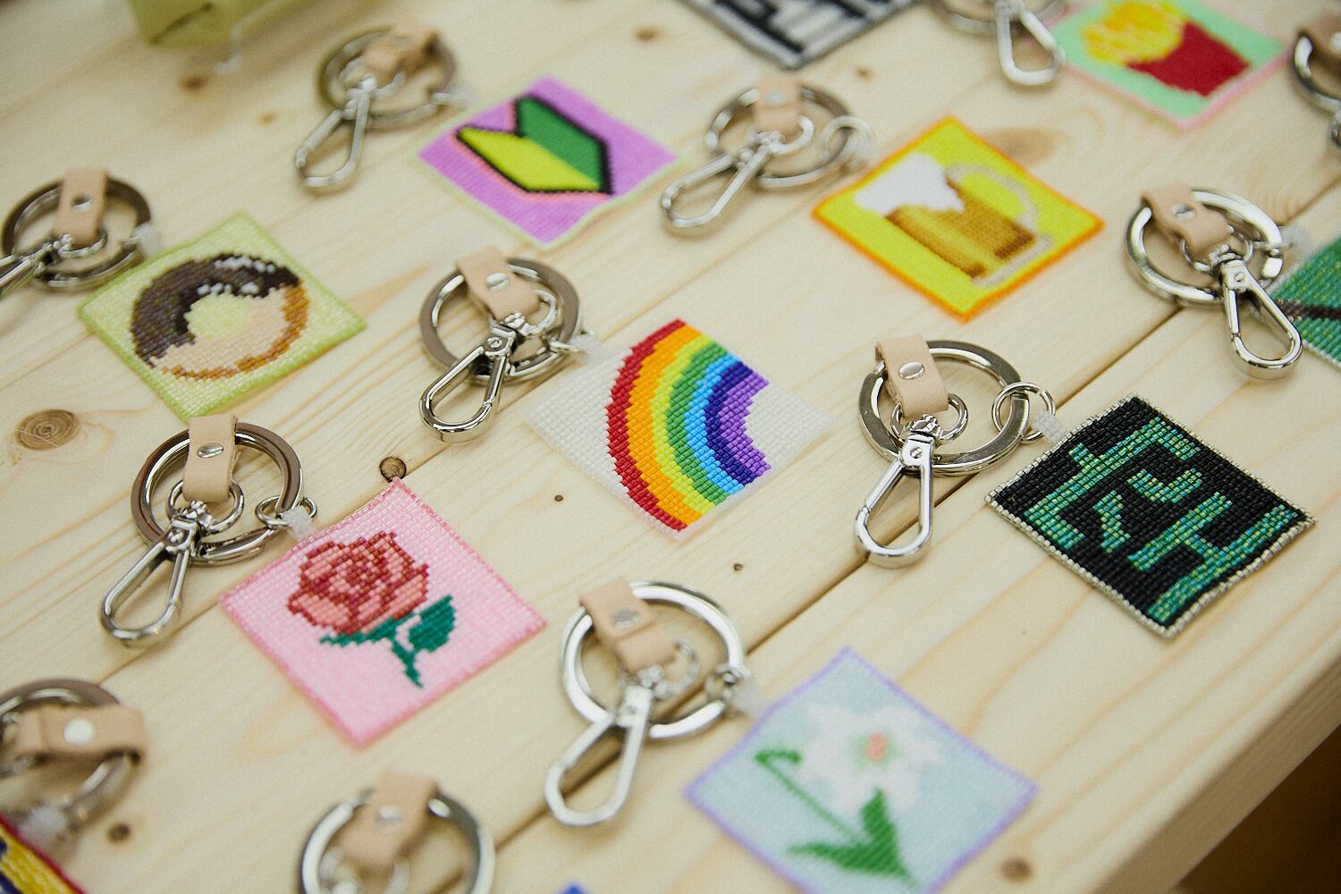 小さなガラスビーズを一粒ずつ織って作ったキーチャーム。織り機を使って手作業で製作しています。