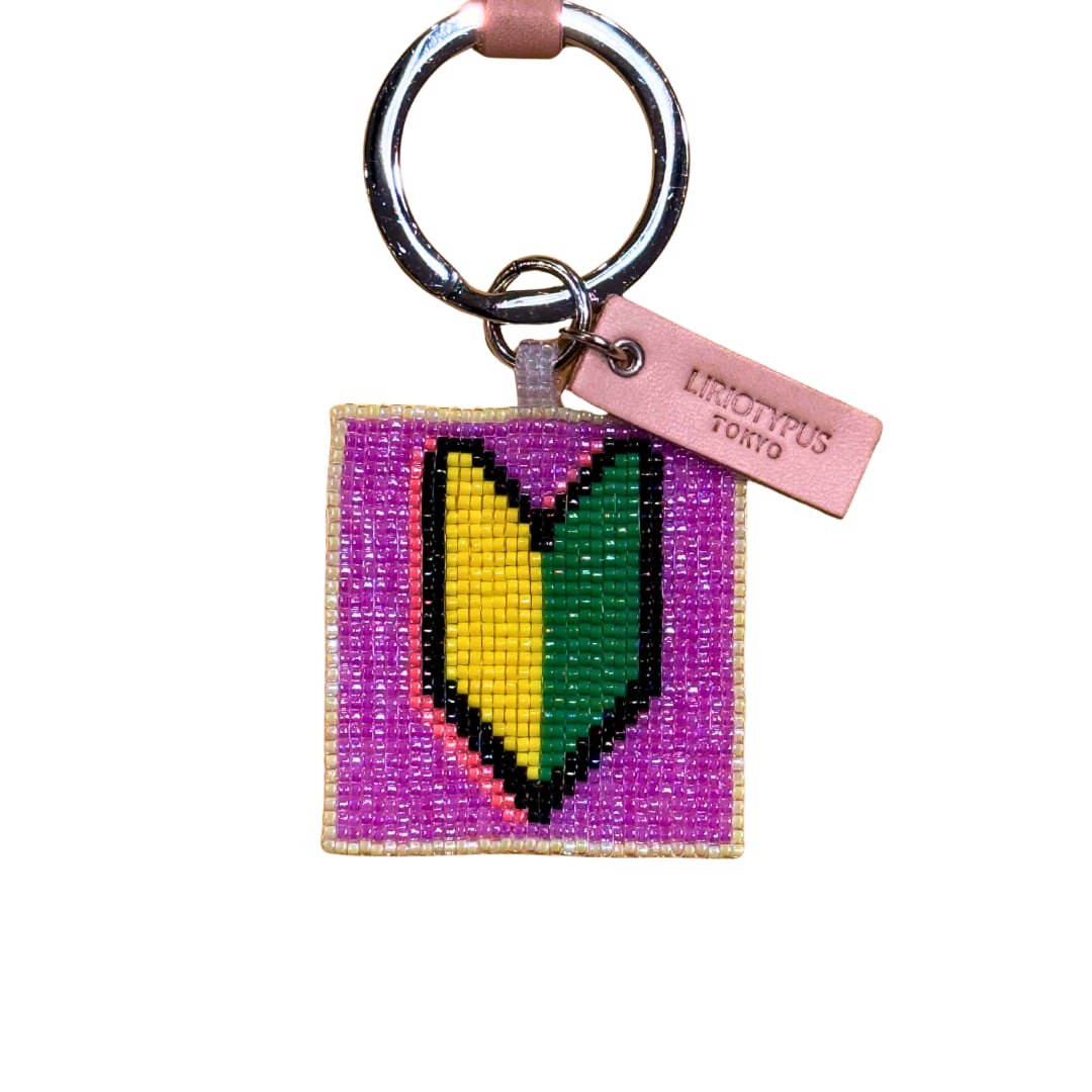 小さなガラスビーズを一粒ずつ織って作ったキーチャーム。織り機を使って手作業で製作しています。